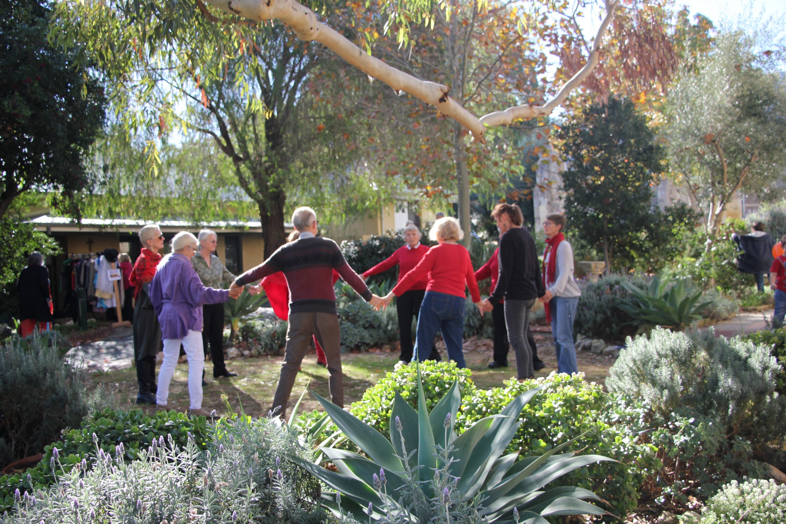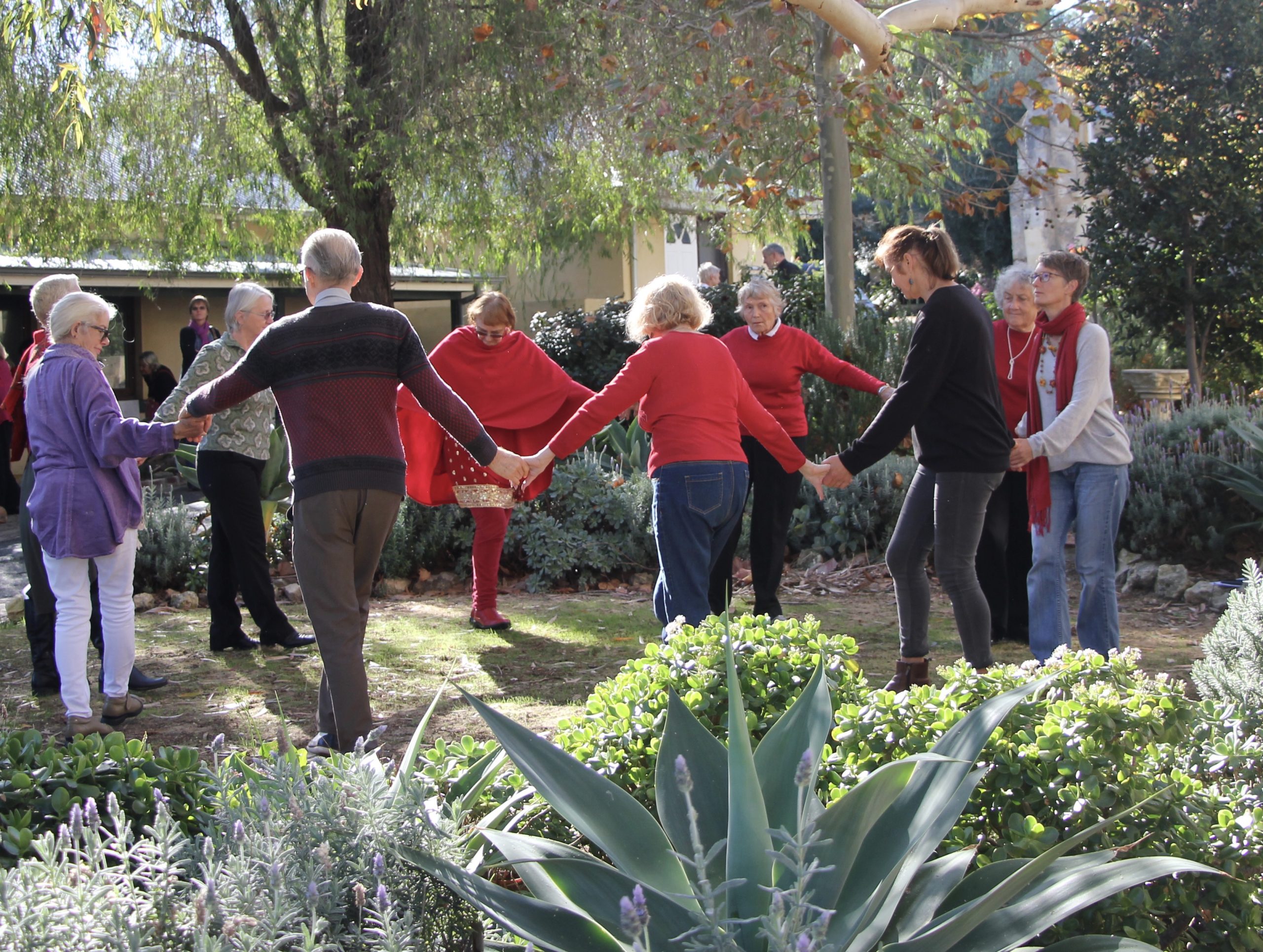 After the choir at St Pauls’ Beaconsfield sings the postlude at our Sunday service, those who wish to join in “The Elm Dance”. They gather in the circle dance area outside the church before going up to coffee in the hall.